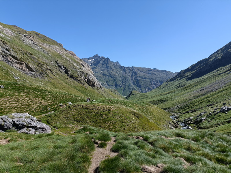 Nous laissons la cabane sur notre droite et suivons un sentier qui s'engage dans la vallée de la Canau en longeant un ruisseau. Après 2 km de montée noupouvons profiter d'un replat qui longe le ruisseau et traverse de beaux paturages fortement colonisés par les marmottes qui nous accompagnent de leurs cris stridents.