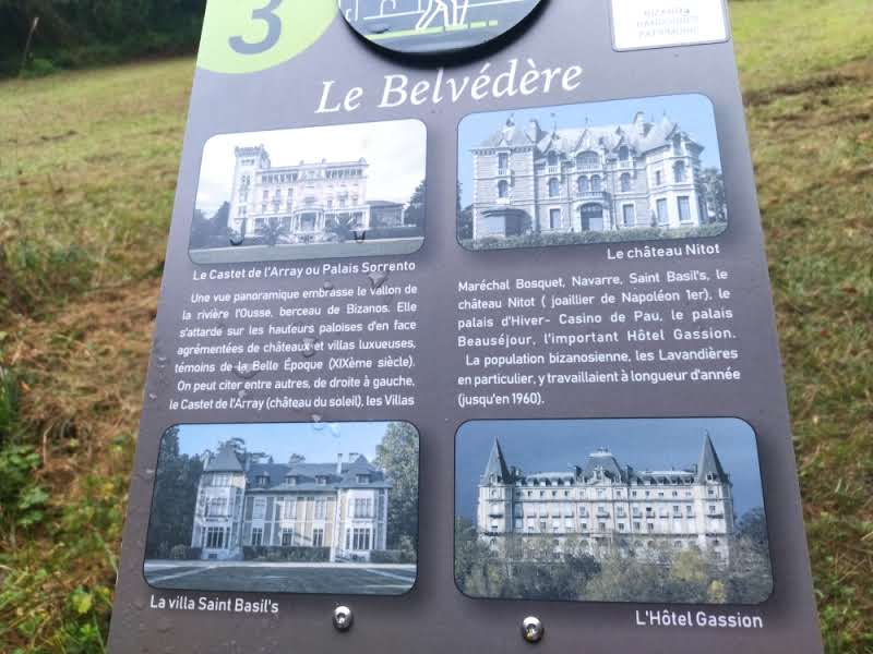 Un belvédère nous renseigne  sur les célèbres demeures de Pau. Nous voici arrivées au parc du château de Franqueville, la commune de Bizanos en est propriétaire  depuis 1988. Il est agréable de se  promener dans ce grand parc avec ses parterres de fleurs, ses grands arbres, ses installations.