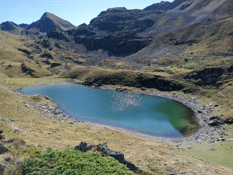 2 heures 45 plus tard, c'est l'arrivée au lac, splendide sous le soleil. (D'après le site www.lacsdespyrenees.com, le lac Bleu mesure 52 ha et a 135 m de profondeur ! Ce lac naturel a été légèrement rehaussé et il est percé par une galerie depuis 1831 pour régulariser le débit de l'Adour.)