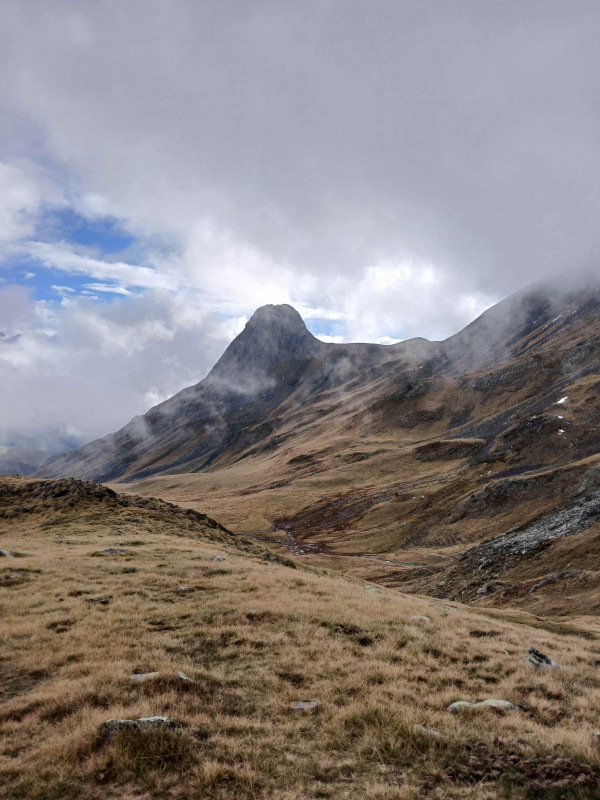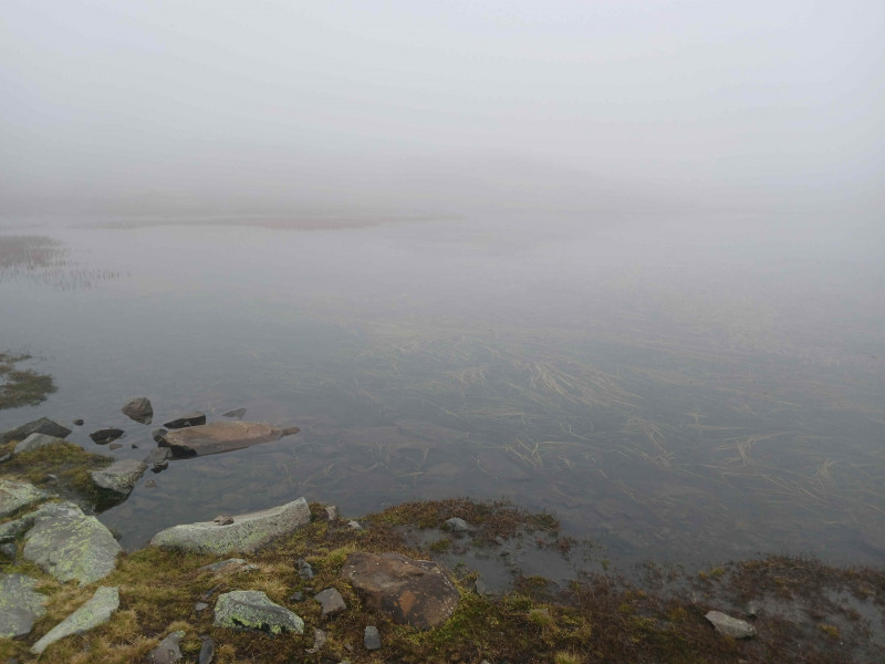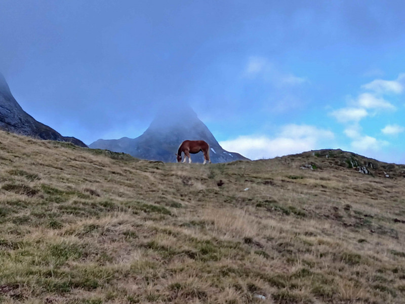 Par contre la visibilité est de plus en plus restreinte, l’air de plus en plus froid. La pente n’est pas trop raide et enfin on touche le but : un laquet, un autre, et encore un jusqu’au fameux lac d’Houer. Malheureusement, on n’y voit pas à 20 mètres. Le beau cirque d’Anéou ne dévoile pas sa beauté sauvage. Pas de pique-nique au froid, retour vers la voiture.