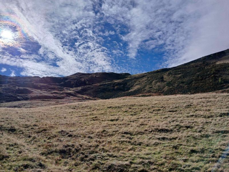 A 9 h 45, la troupe emprunte un joli sentier bien pentu qui traverse les prairies où paissent encore quelques bovins et ovins, la tonte est parfaite.