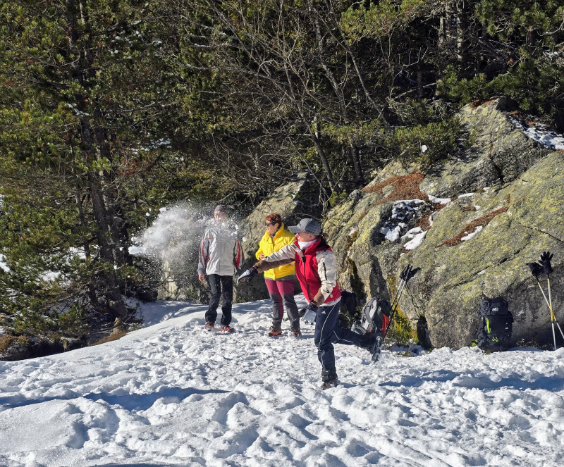 Vers 12h30 nous nous installons sur quelques rochers et dans la neige pour passer au casse croûte, tout se passe bien puis vers 13h15 je ne sais pas qui a lancé les hostilités mais une tempête de neige s'abat sur tout le groupe .(voir photos).