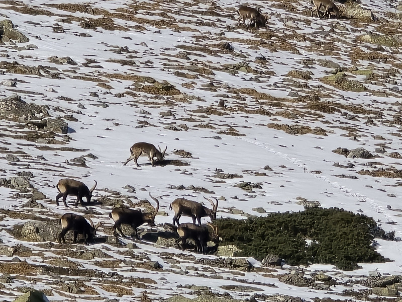 A 14h00 reprise de la descente vers le parking, nous apercevons un groupe d'une dizaine de bouquetins sur les pentes encore un peu enneigées.