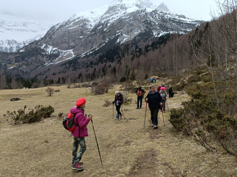 départ de la randonnée. L'humeur générale est au beau fixe et c'est donc d'un bon pas que nous débutons cette randonnée en empruntant un sentier en surplomb du village de Gavarnie. Le soleil brille, il fait chaud et après quelques centaines de mètres d'ascension chacun adapte sa tenue pour continuer vers le plateau de Bellevue (1680m) que nous atteignons vers 12h.