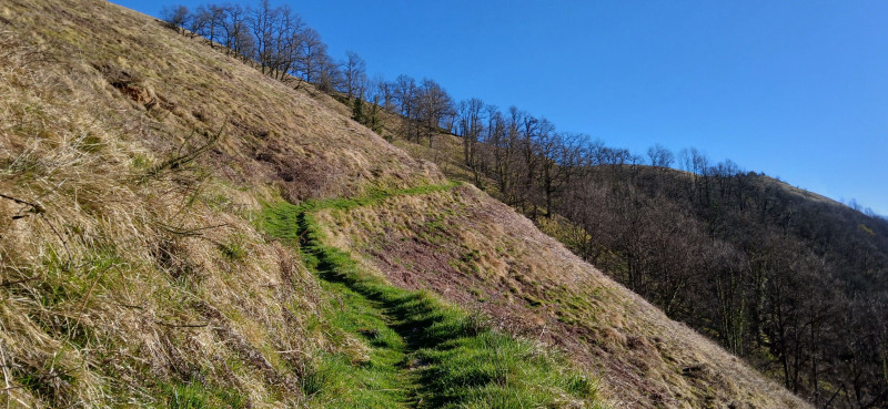 Au début c'est gentillet, ça monte lentement sur un sentier bordé de noisetiers. Un virage à droite, une piste plus large et puis c'est la grimpette . Il fait chaud, les habits tombent.
