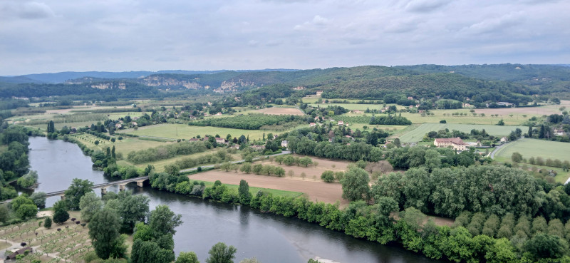 A partir de là, nous longeons la calme Dordogne où naviguent déjà les gabarres touristiques, le sentier passe au milieu des noyers près des anciens séchoirs à tabac. Au fond le château de Castelnaud-La-Chapelle domine la vallée.