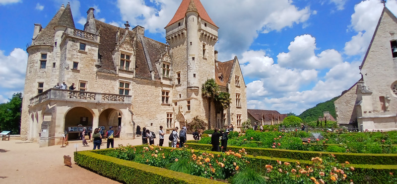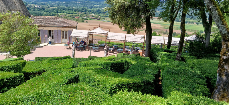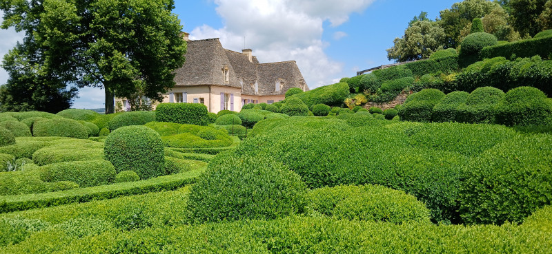 Nous pique-niquons au pied du manoir. Nous parcourons le site classé autour d’un château couvert de lauzes du début du XIXe siècle. Les jardins offrent plus de 6 kilomètres de promenades bordées de 150 000 buis centenaires taillés à la main et agrémentées de belvédères, rocailles, cabanes en pierre sèche…et plus étonnant un squelette d'allosaure!... Perché sur un éperon rocheux, le Belvédère offre une vue fabuleuse sur la vallée depuis Beynac jusqu'à La Roque en passant par Fayrac et Castelnaud .