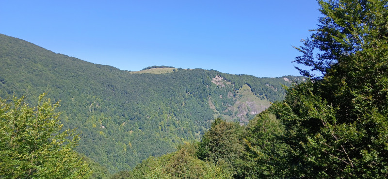 Le balisage ancien laisse à désirer et c'est vers 10 h 30 que nous débouchons dans une clairière et là, le paysage vaut les difficultés ressenties pour l'atteindre. Au fond la crête des mails lourdais avec le prat d'Aurey rejoint les pics de Miqueu et du Larbastan.