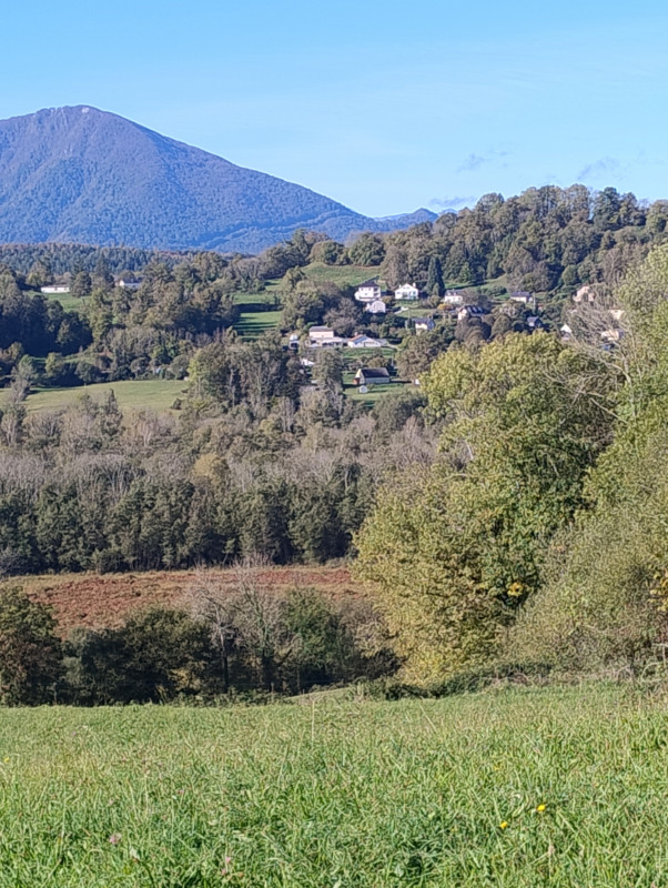 Un sentier où nous accédons par un escalier nous amène à l’entrée de Bartrès, village à 5 kms de Lourdes et de 560 habitants. Nous pouvons admirer de belles et récentes maisons. Nous prenons à notre gauche le chemin de Poueyferré, sentier bien sympathique bordé de prairies,