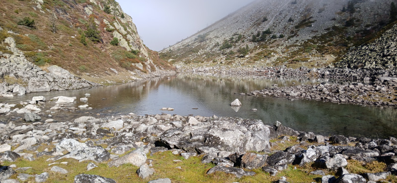 Après une heure de route dans un brouillard humide nous arrivons au lac d’Estaing.