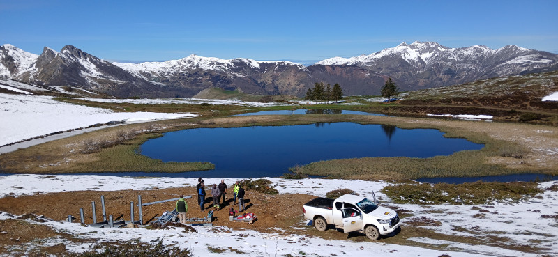 Nous étrennons le belvédère sur la vallée, construit dans le cadre de l'aménagement du Soulor . Nous basculons vers le petit lac de Soum, où des ouvriers s'affairent. Nous franchissons les crêtes , frôlés de près par des Vététistes (à assistance électrique quand même!), plongeons sur la cabane de Cantau relookée façon jardin public avec un banc géant. Nous y mangeons rapidement au soleil, les fesses dans la neige récente, sous une petite bise qui ne nous permettra pas de lézarder .
