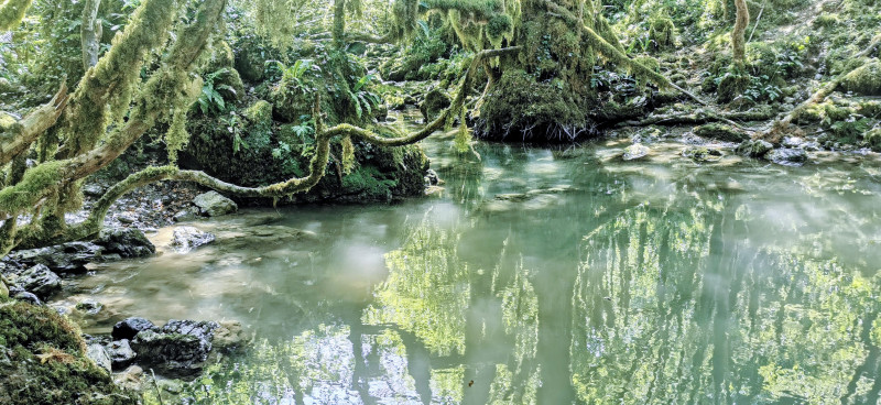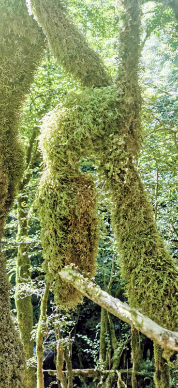 La rando peut commencer dans un décor étonnant mêlant lichens, mousses, fougères variées de la scolopendre à la capillaire en passant par la fougère femelle, parité oblige, et arbres aux silhouettes spéciales. Nous longeons, par un petit sentier ombragé, l'Arros ou ce qu'il en reste, tant la sécheresse touche aussi cette région. La fraîcheur est tout de même présente en cette journée très chaude par ailleurs. La végétation malgré tout souffre.