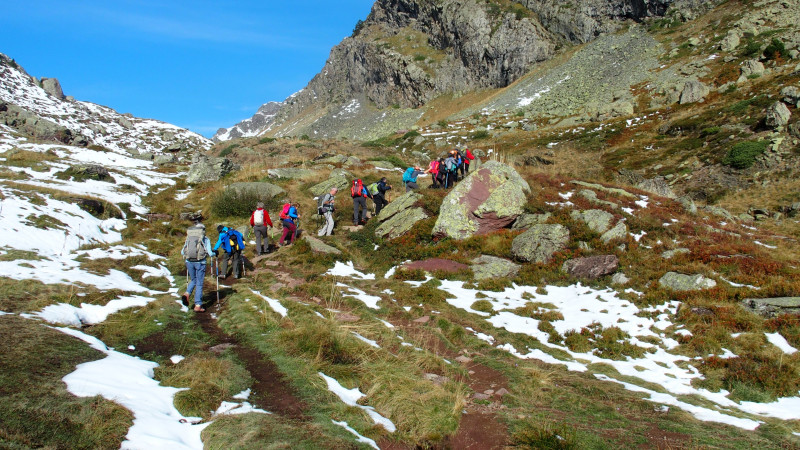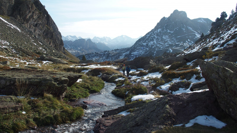 Alors que descendait un dernier troupeau, nous nous sommes engagés sur un agréable sentier ensoleillé, ponctué de traversées de ruisseaux, et de passages de pans de neige tombée précocement.