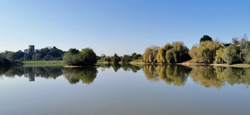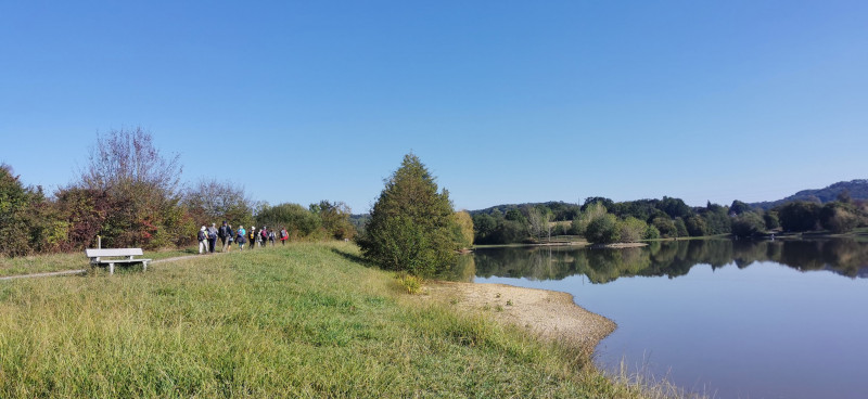 Marche de 10km au bord du lac du Grècq dominé par la tour Moncade .