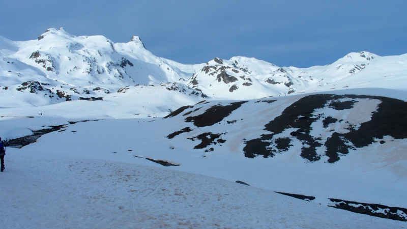 Nous montons dans un large couloir en direction du pic de Canaourouye. La pente est par moment sévère et le vent fort n'est pas très chaud.