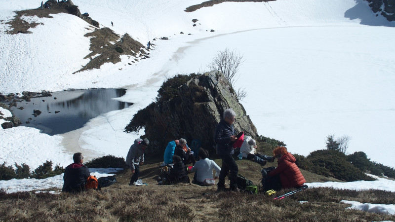 Au sortir de la forêt, vers 1500 m, nous avons dû progresser dans la neige jusqu'au lac gelé à 1760m d'altitude où nous avons pris nos aises pour déjeuner et profiter d'un moment de détente après une ascension de 650 m.