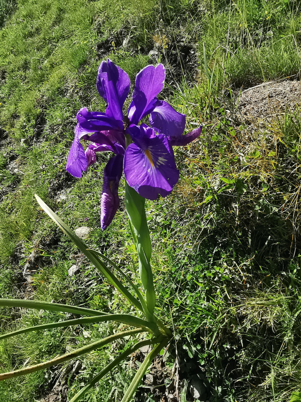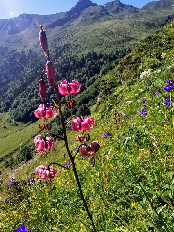 Là, les choses sérieuses commencent. La pente devient rude avec en plus la chaleur. Mais le paysage adoucit un peu les difficultés. La flore a bien voulu se draper de ses plus belles tenues: des iris à perte de vue, des lys martagons, des rhododendrons encore fleuris, des arnicas... bref la montagne fleurie (voir les photos de Yolande)
