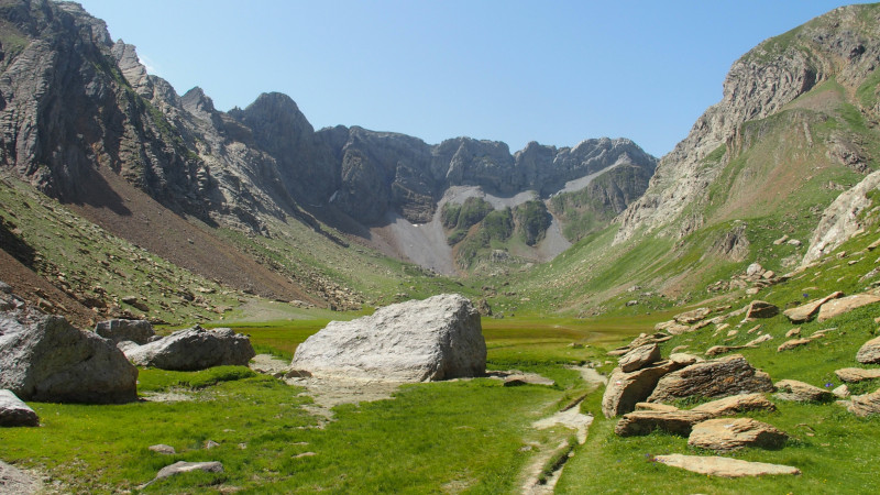 Là, le peloton se sépare: 13 vont directement au lac, et les autres (24 moins 13, ça fait 11 je crois ah oui! c'est ça.) continuent d'un bon pas vers le cirque d'Olibon, quelques 200 m plus haut. Ils y mangeront dans un cadre merveilleux, tapissé d'herbe rase, au bord d'un laquet asséché avec au fond une barrière rocheuse parfaitement circulaire. Au loin un isard les salue!