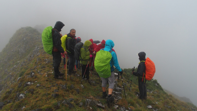 On suit un peu la crête, ce doit être beau par temps dégagé…On avait dit boucle ? Mais : sentier improbable, pas balisé, brouillard de tous côtés, les organisateurs n’ont pas voulu se mouiller (rires) on est redescendu par où on était monté (glissades assurées) tout en rêvant à un p’tit coin d’parapluie.