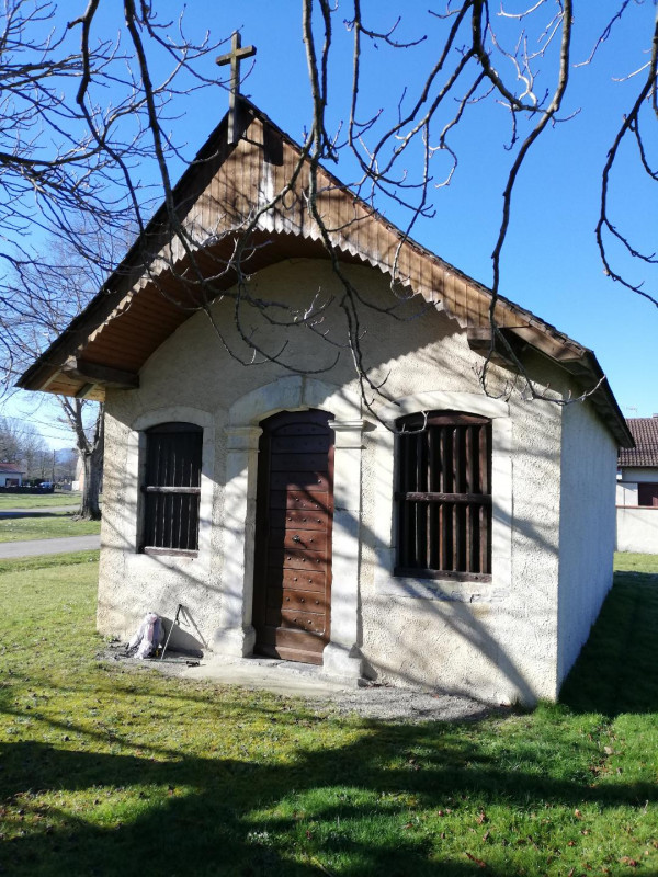 trouve la troisième petite chapelle à l’entrée du village. Sa façade comprend une porte et 2 fenêtres. Nous profitons de cet arrêt pour ramasser des marrons ( ayant dit-on quelques vertus : soulagement de l’arthrose, éloignement des araignées, à voir !!!!)