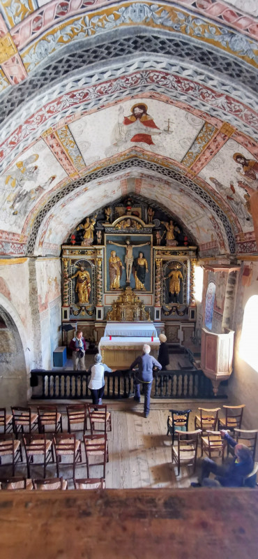 Remarquables peintures également sur les murs et la voûte. Le retable « Renaissance » occupe tout le mur du chevet du choeur. Il est divisé en trois panneaux séparés et encadrés par des colonnes torses. Le centre du panneau est occupé par un bas-relief de la Vierge et de Saint Jean encadrant le Christ en croix. Dans les panneaux latéraux, deux niches reçoivent deux statues : à gauche, Saint Barthélémy tenant un livre ouvert et un couteau, à droite, Saint Exupère en guerrier avec tunique, bottes et bonnet phrygien, tenant une lance et la palme du martyre.