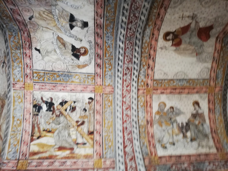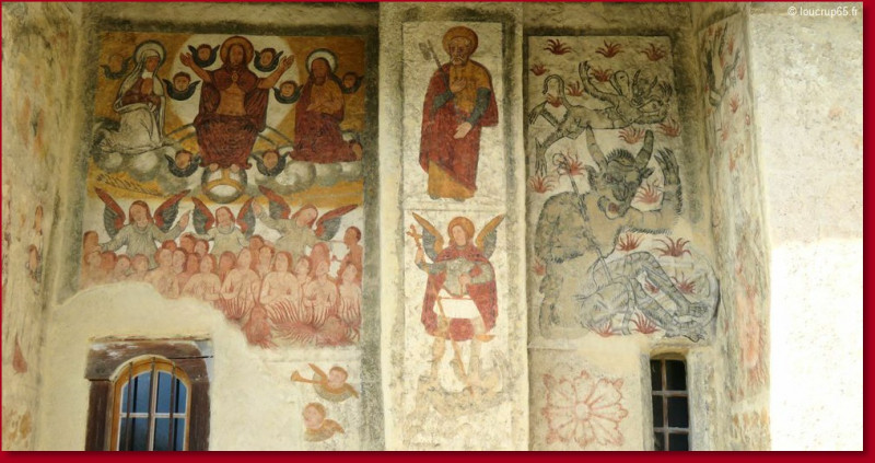 Les peintures extérieures du mur sud sont surtout célèbres pour son « diable » à droite, dans une scène de l’enfer. Au centre : Saint Pierre et Saint Michel. Ces peintures sont du XVIe siècle (1573).