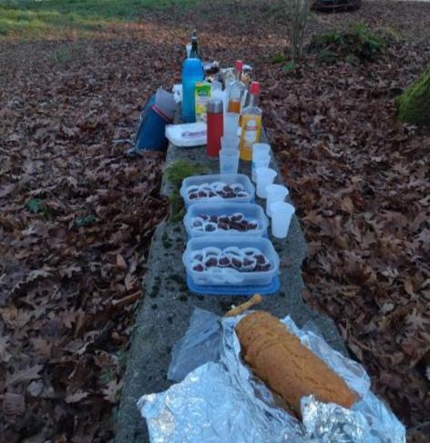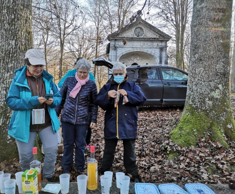 Le moral reste au beau fixe et nous  repartons  en chantant, jusqu'au   parking du sanctuaire. Le petit convoi de quatre voitures se dirige  sur l'esplanade du chemin de croix " encore un "pour partager le gouter de l'amitié, le cidre et le punch coulent à flot, les papillotes et les clémentines roulent sur le banc de pierre . Les cakes présentent leurs belles tranches, les chocolats fait maison sont délicieux.  Yvon notre chef de choeur  nous entonne deux beaux chants que nous reprenons tous ensemble. C'est la fête.🥂🥂.