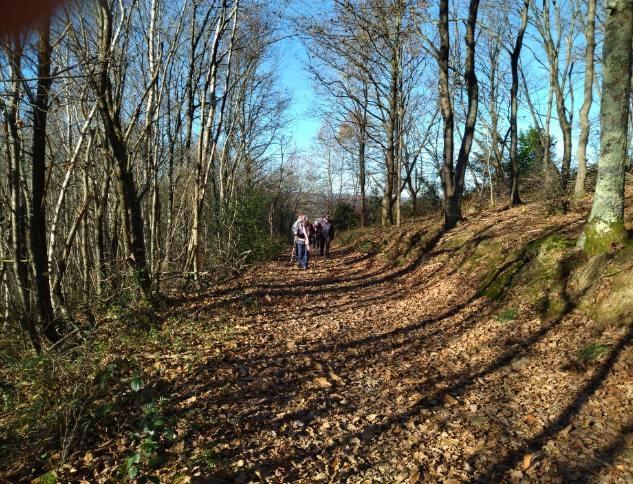 Le fléchage nous indique un escalier en bois glissant pour atteindre le chemin des crêtes. Au bord de la route le chantier d'une charpente en forme de dôme recouverte de tuiles en bois nous intéresse et les charpentiers nous expliquent cette technique de couverture très ancienne. Après cette pause nous reprenons notre route pour traverser le bois de Montaut. Le sentier est très boueux. Il ne faut pas rater son planté de bâton pour éviter les glissades mais tout le monde s'en sort fort bien.