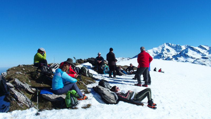Direction la Pène de Caucipeyre que nous atteignons vers 11h30 après 1h de marche. A ce moment là, une partie de la troupe décide de s'installer au soleil tandis que l'autre continue pour une petite heure supplémentaire sur les sommets alentour avant de se retrouver pour déjeuner.