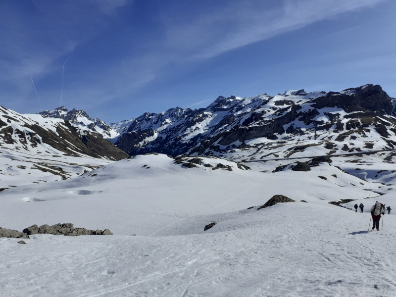Le groupe repart, une moitié avec des crampons, l’autre avec des raquettes. La neige est un peu plus molle, les traces plus rares.
