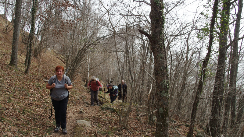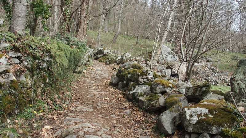 La large piste traverse une belle hêtraie, longe de vertes prairies cernant des​ granges. Ensuite, elle se transforme en beau sentier pavé encaissé entre deux murets surmontés de noisetiers, vestiges de temps pas si anciens que cela.