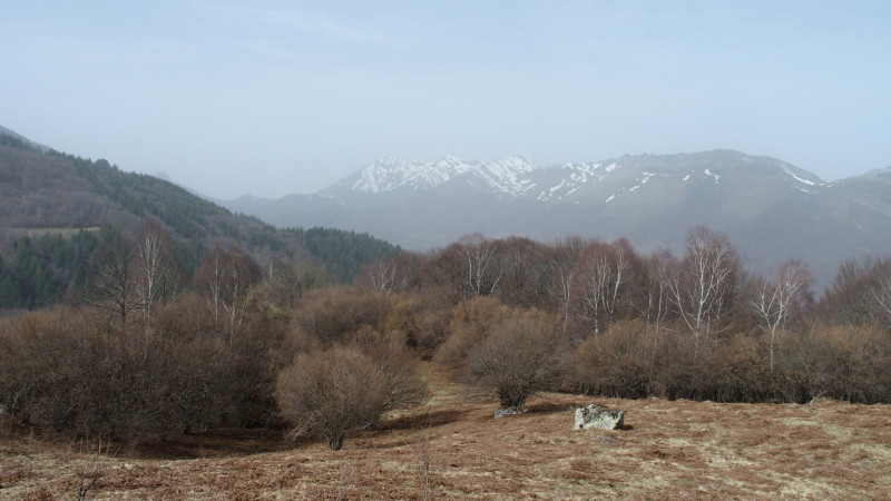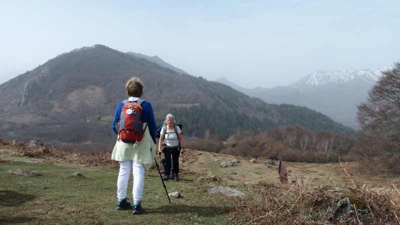 La balade peut commencer. La première partie est une longue montée orientée sud. Le sentier est large, avec trois ou quatre portions bien pentues, alternant avec des passages plus faciles. Partout, ce ne sont que fleurettes printanières, chants d’oiseaux, dans une température déjà très douce. Nous surplombons la route qui monte vers le Soulor, avec en face, le Cabaliros au crâne encore un peu blanc, et en contrebas le lac d’Arcizans-Avant.