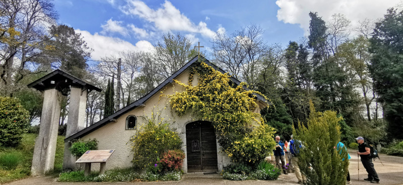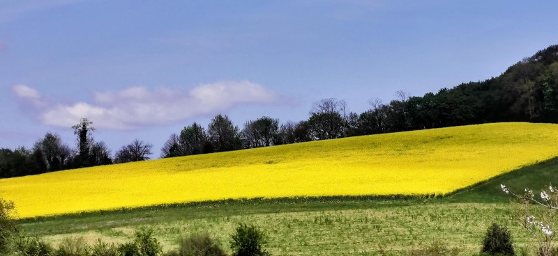 Des étendues de colza d'un jaune vif décorent la campagne environnante. Nos pas nous mènent vers le sanctuaire de sainte Quitterie où niche une jolie petite chapelle dans