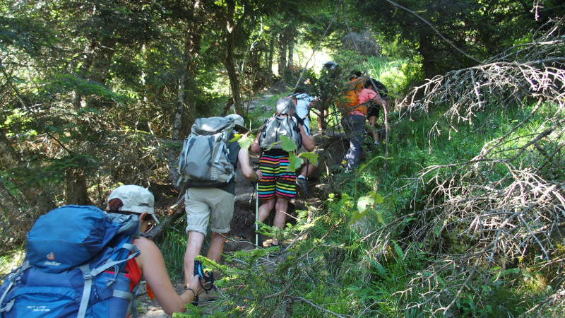 Voitures garées et équipements sur le dos nous nous engageons sur un sentier ombragé en bordure d'un torrent ce qui nous permet de profiter d'une certaine fraîcheur, mais la pente est rude et elle le restera jusqu'au lac situé 620 m plus haut.