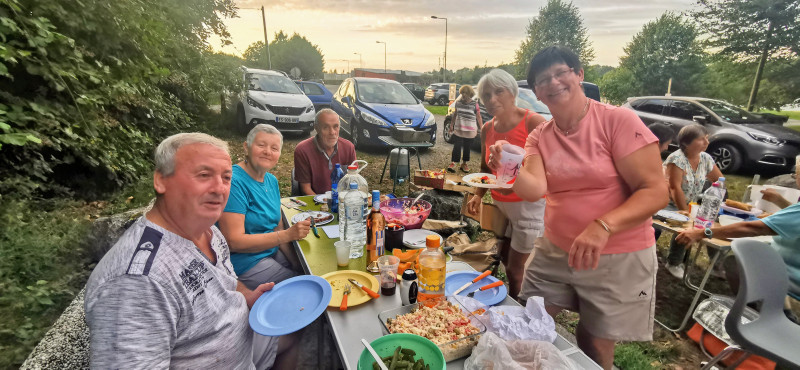jus de fruits et amuse-bouche. Merci à Odile pour nous avoir fait déguster une spécialité bretonne ( saucisse enroulée dans une galette au sarrazin) qui a été bien appréciée, bonne ambiance, échanges autour de ce pot