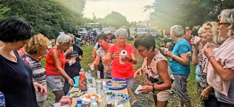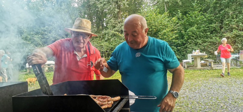 Après 2h30 d’efforts nous voilà de retour à l’espace grillades où déjà règne une bonne odeur. La table du vin d’honneur est en place : belle nappe colorée,  apéritifs variés, jus de fruits et amuse-bouche. Merci à Odile pour nous avoir fait déguster une spécialité bretonne ( saucisse enroulée dans une galette au sarrazin) qui a été bien appréciée, bonne ambiance, échanges autour de ce pot de l’amitié.
