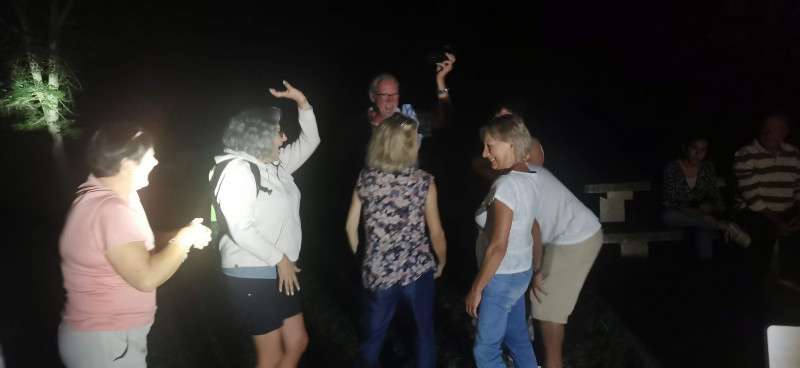 Malgré la nuit tombante et un éclairage improvisé nous avons  entamé quelques pas de danse et chanté tous en cœur. Déjà 23 h  et l’heure du retour a sonné malgré l’envie de danser et de chanter jusqu’au bout de la nuit.
