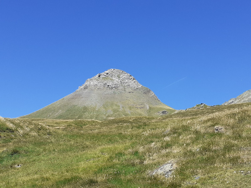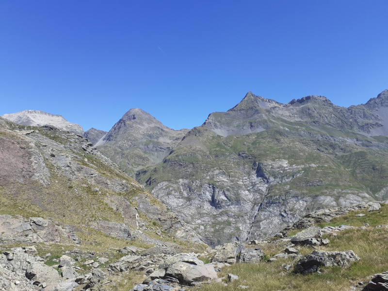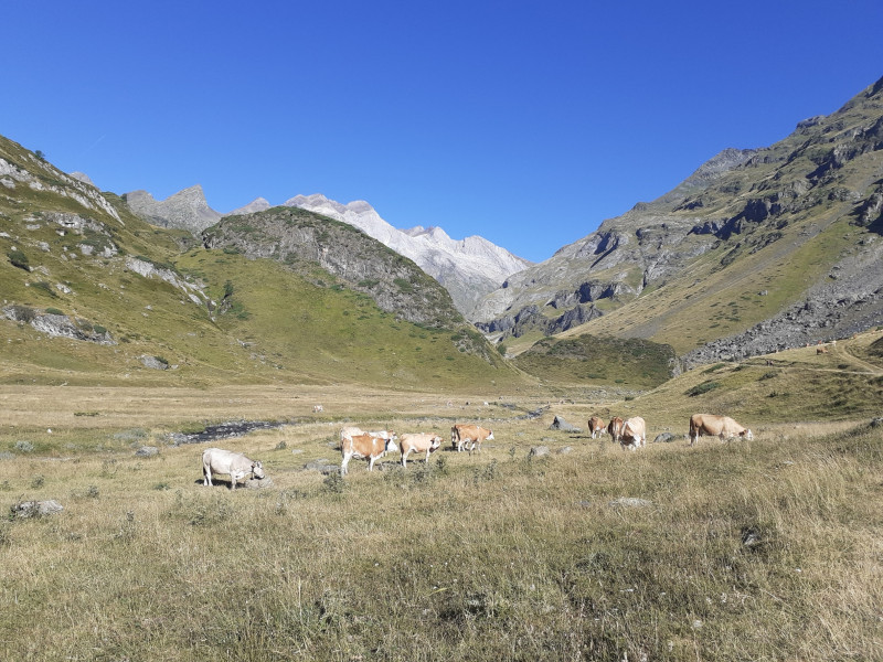 A 10 heures, les treize, réunis, montent gentiment dans la bonne humeur, sous une température encore agréable. Le spectacle est grandiose avec en fond le Vignemale. Un sommet arrondi se distingue des autres, nous l'aurons en point de mire et de repère toute la journée. Son nom , je vous le donne en mille : le pic Rond.