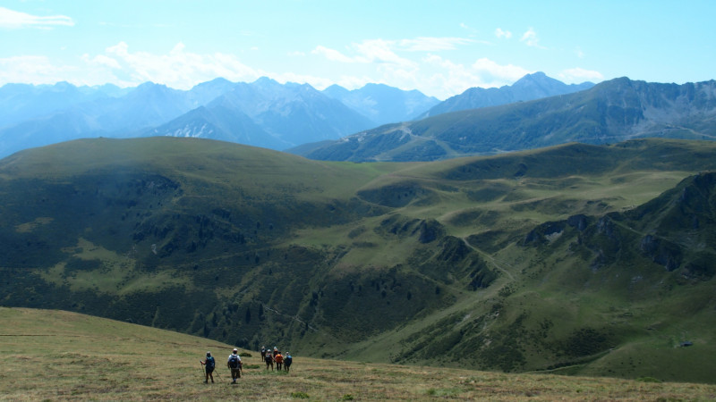 Nous prenons à gauche, le moment est venu de sortir une couche, de mettre les casquettes et de protéger la peau des attaques de l'astre solaire. Quelques gouttes de pluie inquiètent et la marche s'accélère.