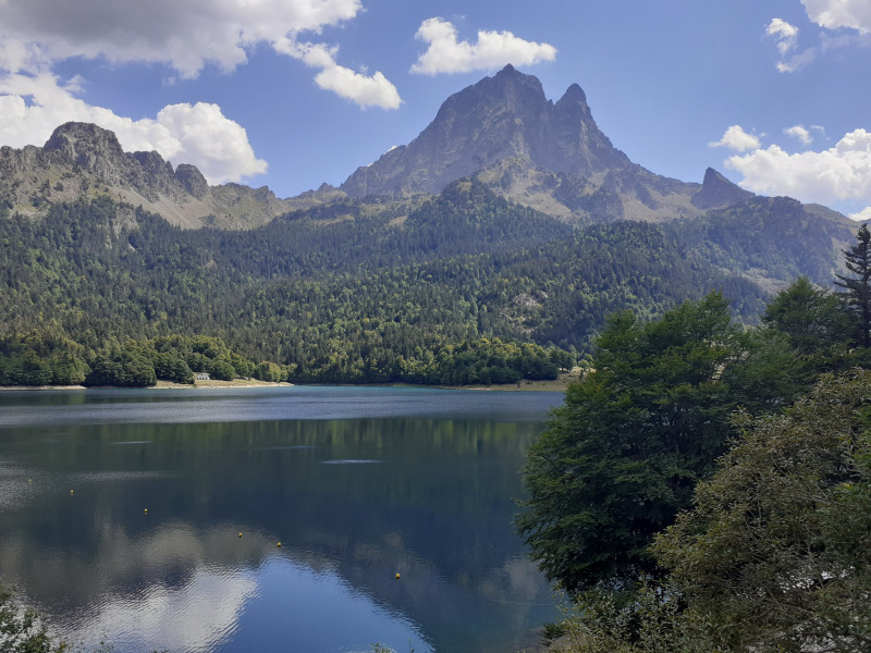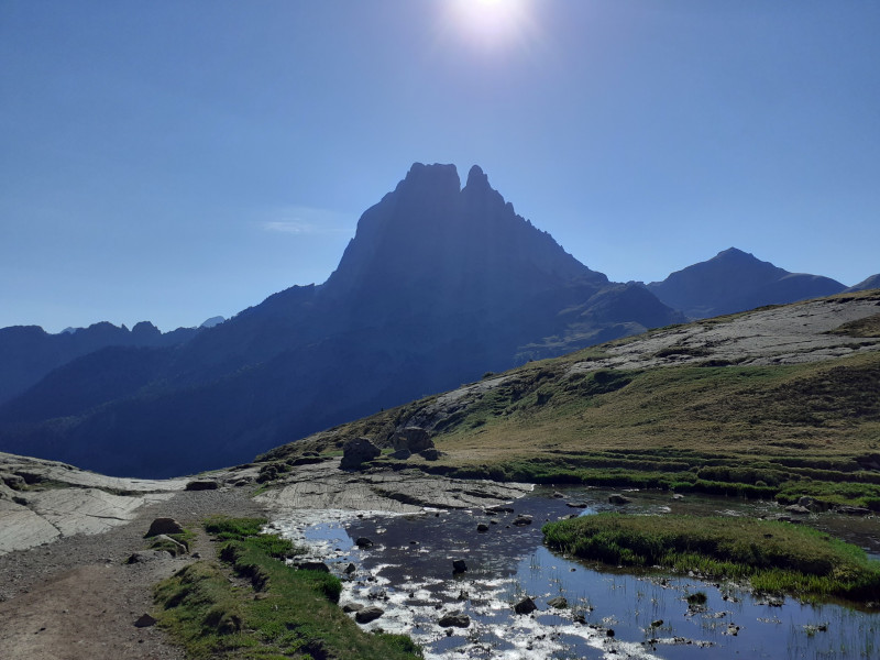 Après la forêt, au pont de Bious, le pic du midi d'Ossau apparaît grandiose en ombre chinoise, éclairé par le soleil du matin. Le sommet emblématique du Béarn ne nous quittera pas de toute la matinée.