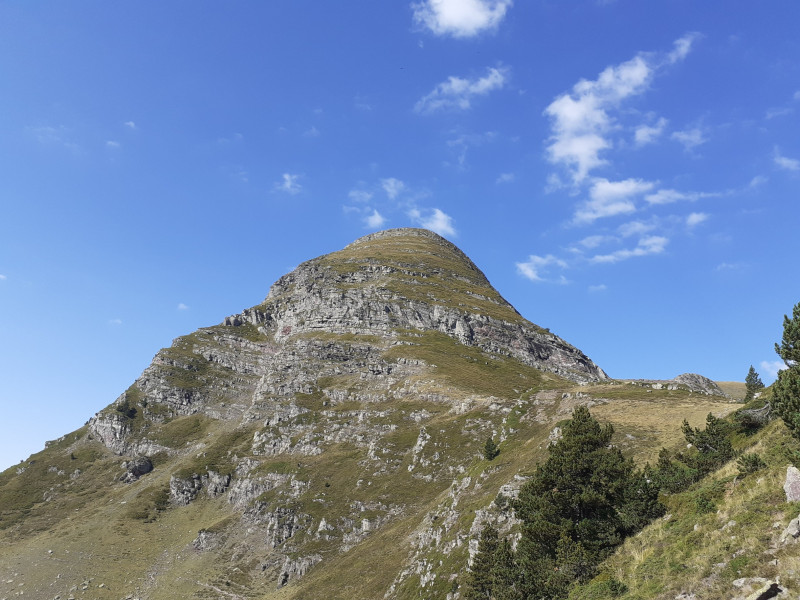 Au-dessus, nous quittons le GR 10 et filons à l'est sur une piste peu marquée. Elle nous fait longer le Pic les Arugos. L'objectif se rapproche. La pente devient de plus en plus raide et le chemin est plus au juger, au feeling.