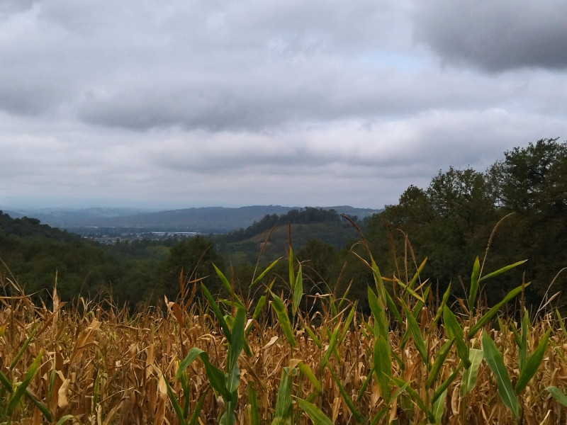 Nous longeons la rue principale avant de  tourner vers les côtes de Galice et de Mourets ( voilà une partie du dénivellé …) Nous arrivons au chemin Henri IV que nous suivrons une partie de la randonnée.   Nous pouvons admirer des beaux points de vue bien que les Pyrénées soient encore sous la brume.  Nous longeons des champs de maïs qui ont souffert eux aussi de la canicule.