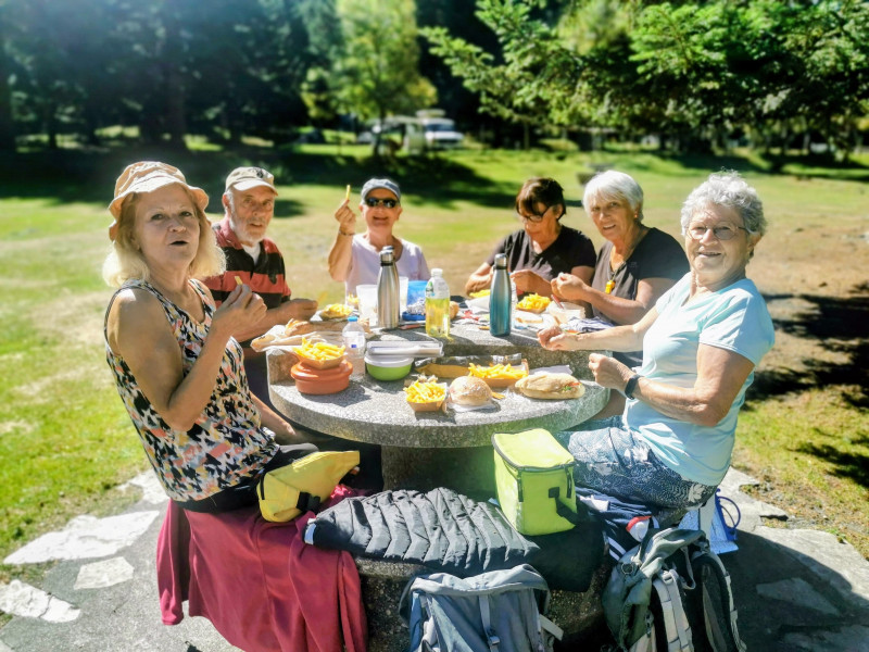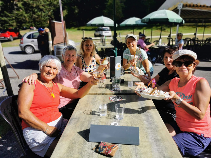 Tous autour de la table ronde comme les chevaliers ça rigole, ça boit du rosé et une lichette de moutarde (enfin) un peu de ketchup et pourquoi pas un soupçon de mayonnaise. Repas festif, joyeux et complet. Aujourd'hui on se la joue cool avec café en terrasse. On n'a pas osé le petit rhum, un peu de sérieux quand même. Il faut repartir pour la deuxième marche de la journée.