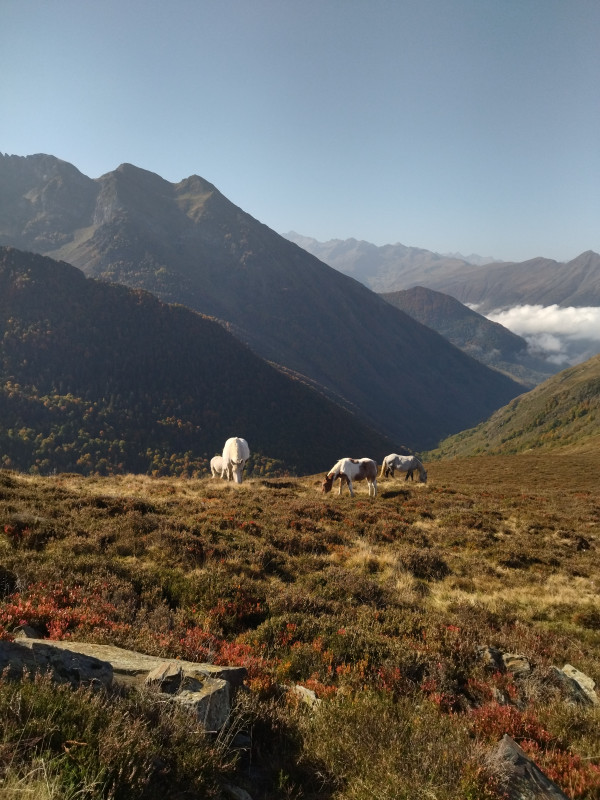 Nous suivons un sentier empierré, au loin nous apercevons des chevaux, des vaches et bien sur des moutons. Quelques fleurs  comme des colchiques, parsèment les bords du sentier.