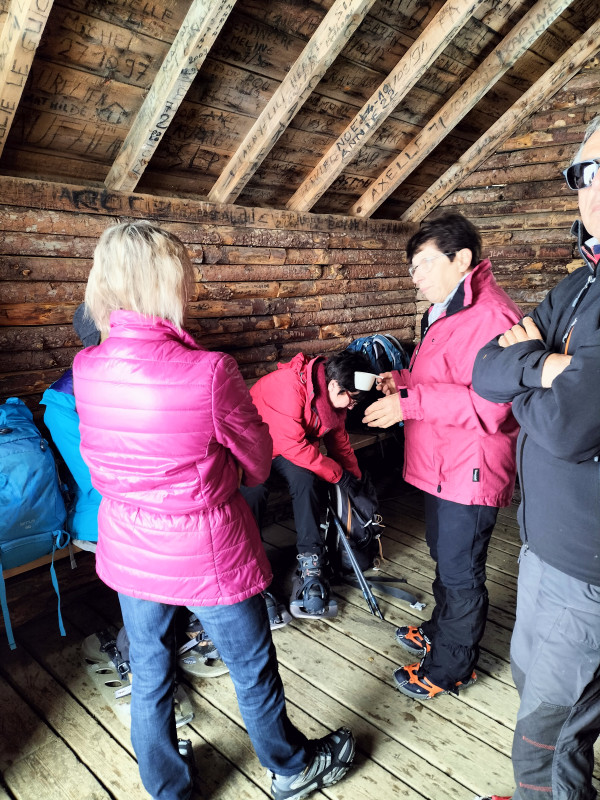 Arrivés vers 12h à la cabane de Cantau notre salle à manger est toute trouvée, magnifique panorama, on s'installe pour le pique-nique et quelques gouttes de pluie viennent perturber le café que certains prendrons dans la cabane...Mais vite le soleil tente quelques percées, Yo et Simone font la photo de famille et nous voici repartis pour le retour.