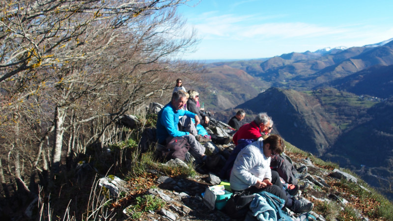 Nous atteignons le sommet vers 12H et profitons maintenant de la vue sur la vallée d'Argelès et les sommets enneigés pour déjeuner, les vautours se laissant porter par les courants d'air  jusqu'au Pibeste.