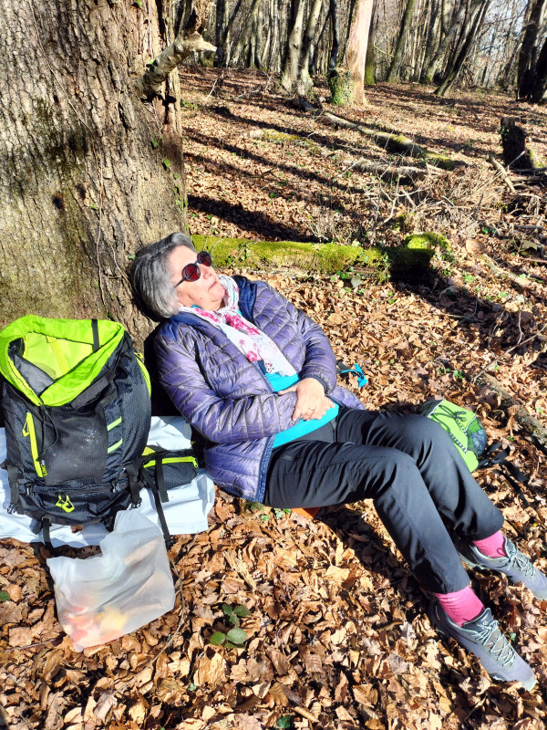 Après cette petite pause nous reprenons la dernière portion du parcours pour nous installer à l'orée d'un bois bien ensoleillé où des troncs d'arbres nous servent de banquette. 12h30 chacun s'installe confortablement pour déguster son pique-nique .