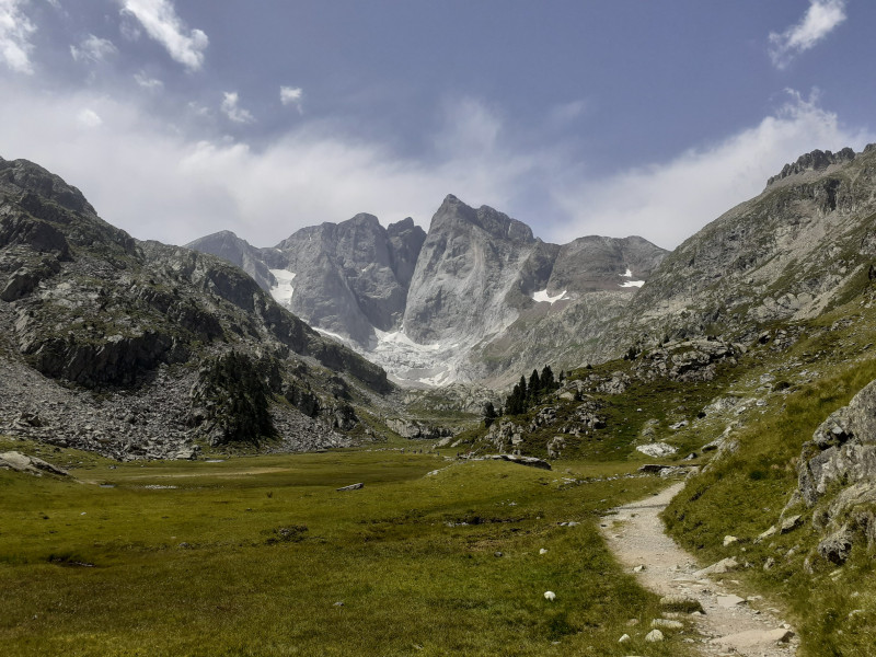 Là, le panorama est impressionnant avec les glaciers des Oulettes et du petit Vignemale, qui malheureusement ne sont pas au meilleur de leur forme ainsi que la barrière que constitue le Vignemale.