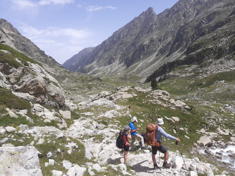 Pendant ce temps, les 8 rescapés cheminent d'un bon pas dans un décor splendide avec au fond le Vignemale granitique et de chaque côté des pointes minérales. Nous suivons le tracé du gave des Oulettes, avec ses magnifiques cascades et ses replats marécageux.