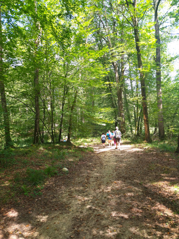 Nous repartons dans les bois, le soleil nous accompagne .  Le sentier caillouteux nous impose de faire attention, un peu du dénivelé est là aussi , qu’ à cela ne tienne  tout se passe bien. Nous arrivons  sur la route où en bordure Lydie a laissé sa voiture  en cas de besoin ( Merci Lydie pour cette gentille attention). Nous sommes tous en forme puisque l’équipe au complet continue par un sentier en direction du parking où nous retrouvons nos voitures.